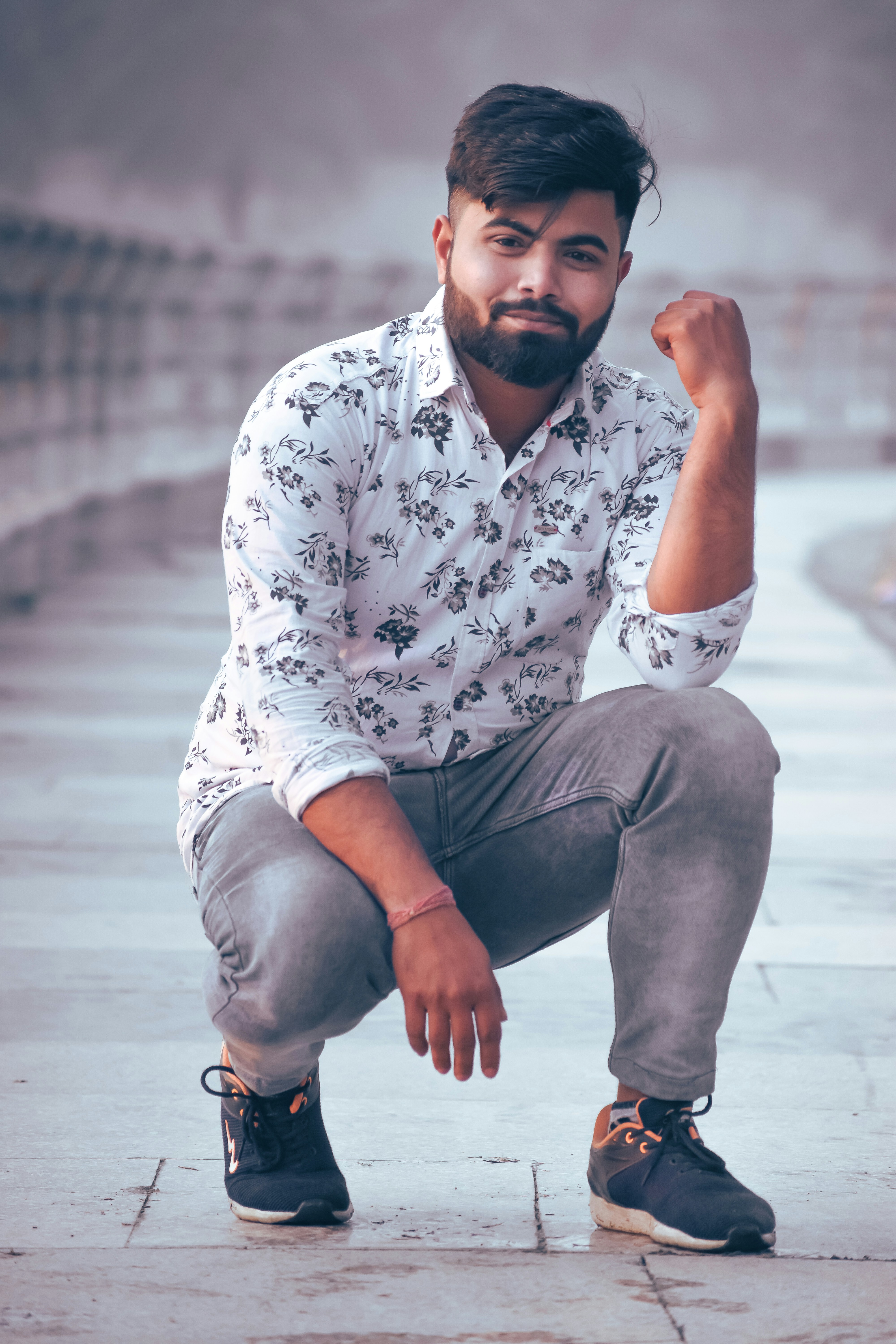 Man In White And Black Floral Dress Shirt And Black Pants Sitting On Floor Photo Free Lucknow Image On Unsplash
